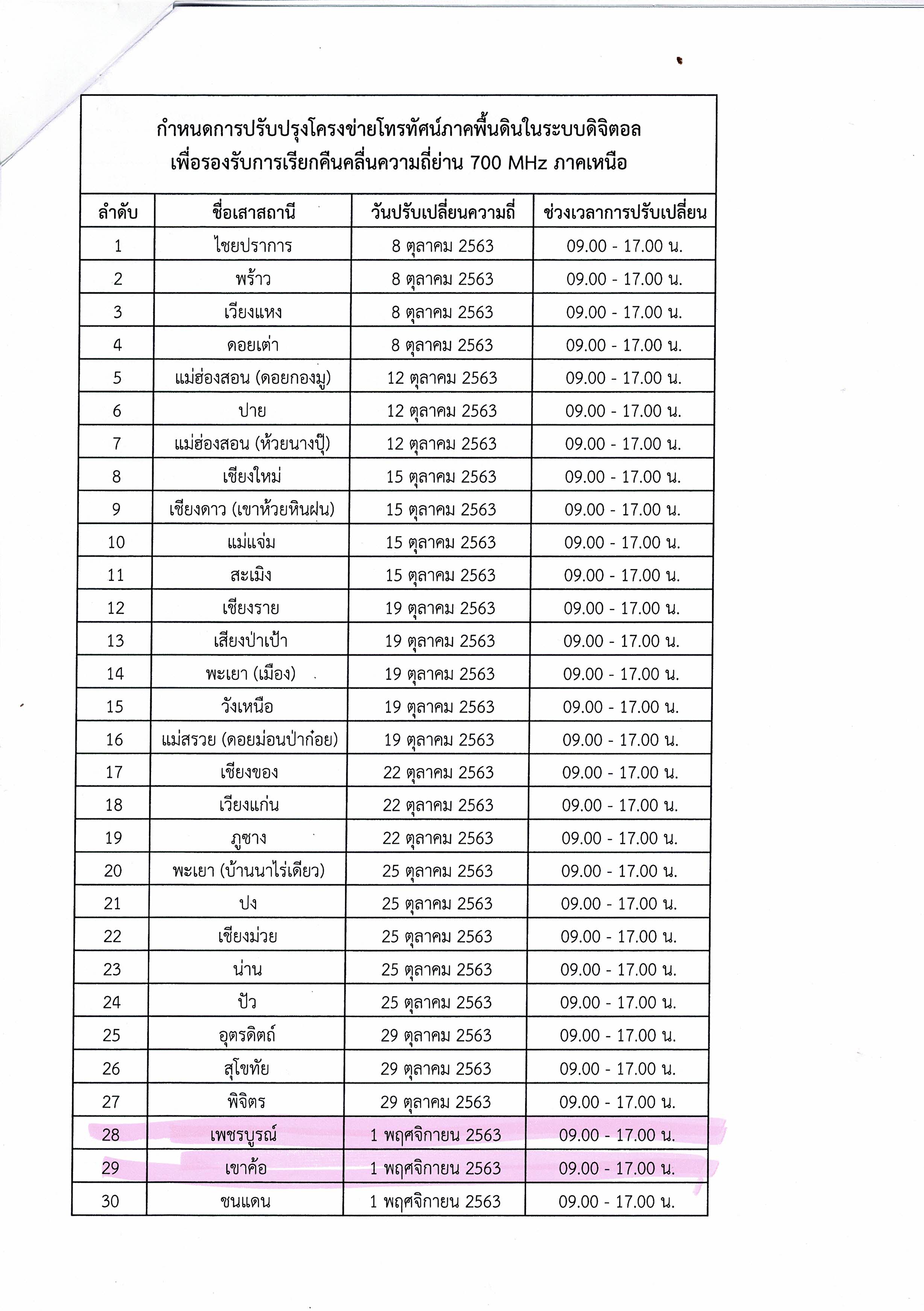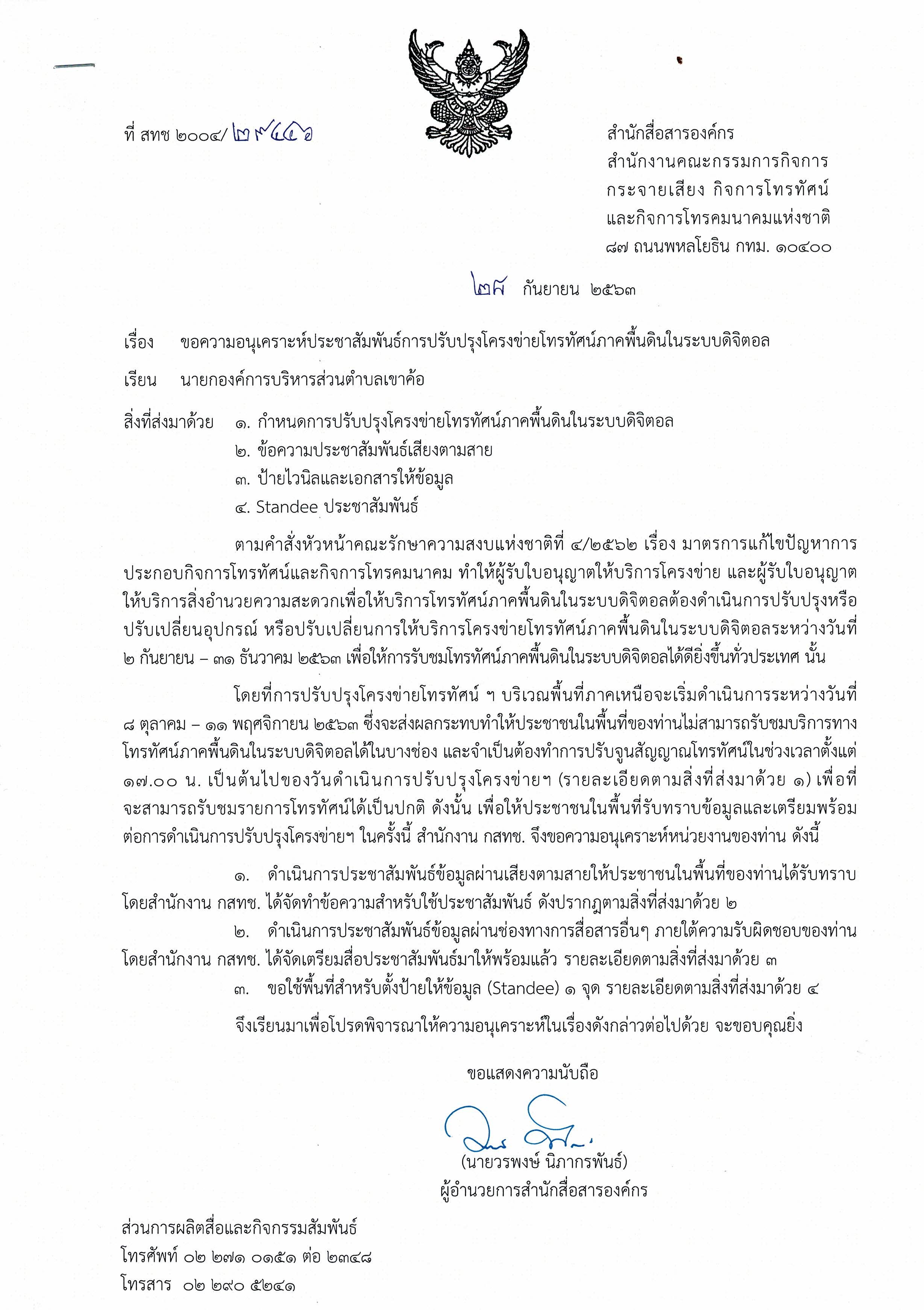 รายละเอียด : องค์การบริหารส่วนตำบลเขาค้อ ขอประชาสัมพันธ์กำหนดการปรับปรุงโครงข่ายโทรทัศน์ภาคพื้นดินในระยยดิจิตอล ของสำนักงาน กสทช. ในพื้นที่จังหวัดเพชรบูรณ์ และอำเภอเขาค้อ มาเพื่อให้ประชาชนได้รับทราบโดยกัน และสามารถแก้ไขตามขั้นตอนที่จัดส่งมาพร้อม นี้