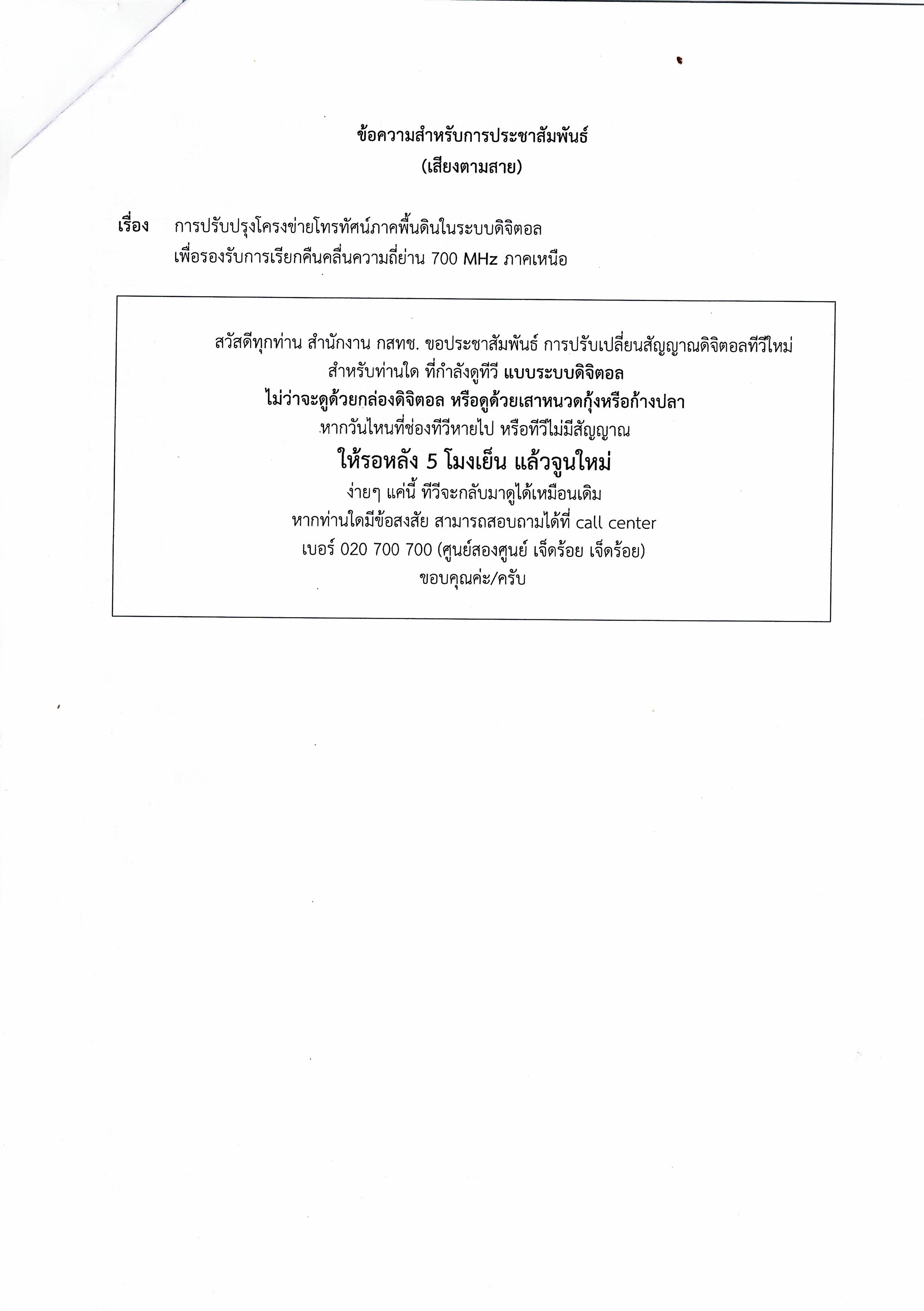 ชื่อเรื่อง : ประชาสัมพันธ์กำหนดการปรับปรุงโครงข่ายโทรทัศน์ภาคพื้นดินในระบบดิจิตอล ของ สำนักงาน กสทช.
