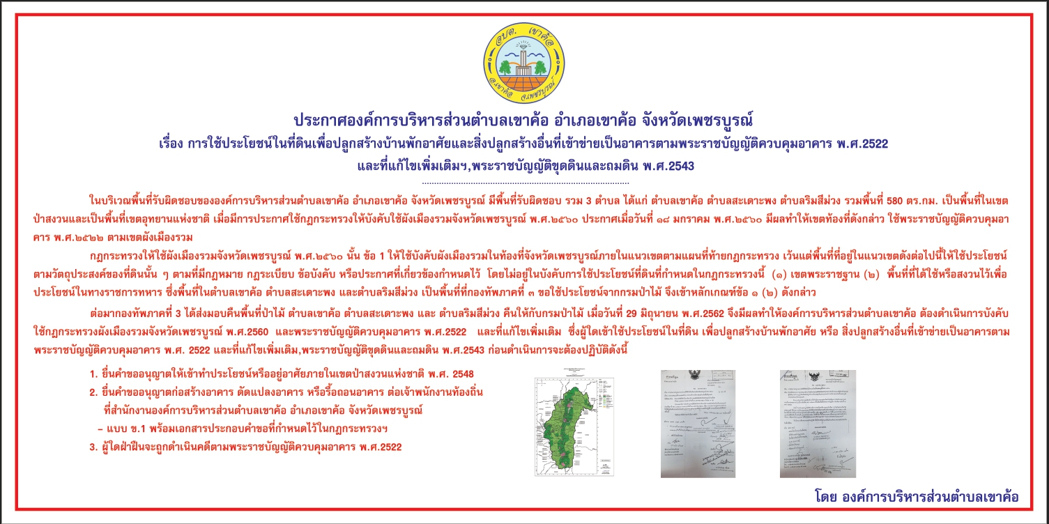 ประกาศ อบต.เขาค้อ เรื่อง การใช้ประโยชน์ในที่ดินเพื่อปลูกสร้างบ้านพักอาศัยและสิ่งปลูกสร้างอื่น ที่เข้าข่าย พรบ.ควบคุมอาคาร พ.ศ. 2522 และแก้ไขเพิ่มติม