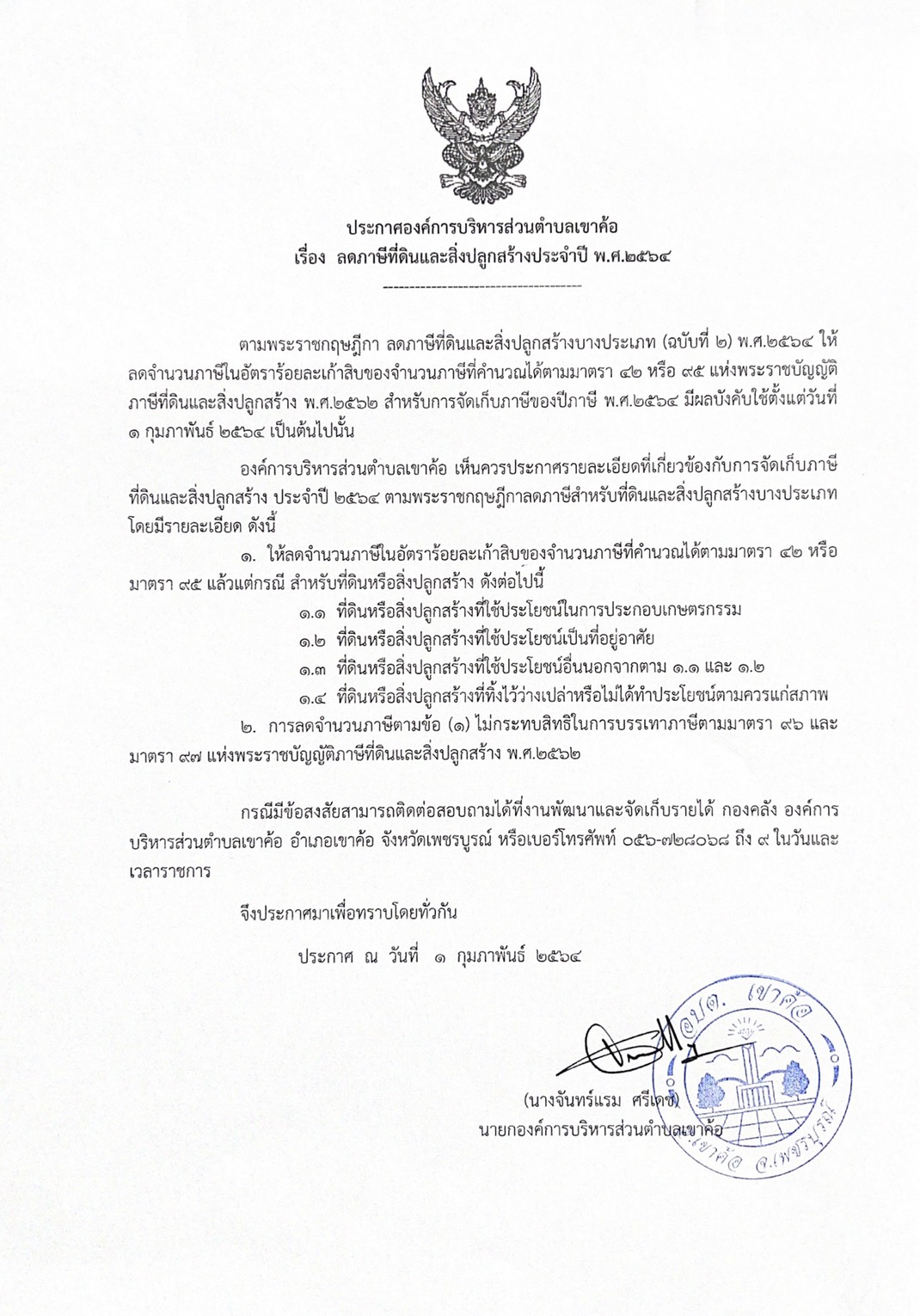 ประชาสัมพันธ์ ลดภาษีที่ดินและสิ่งปลูกสร้าง ประจำปี 2564 ร้อยละ90ของจำนวนภาษี