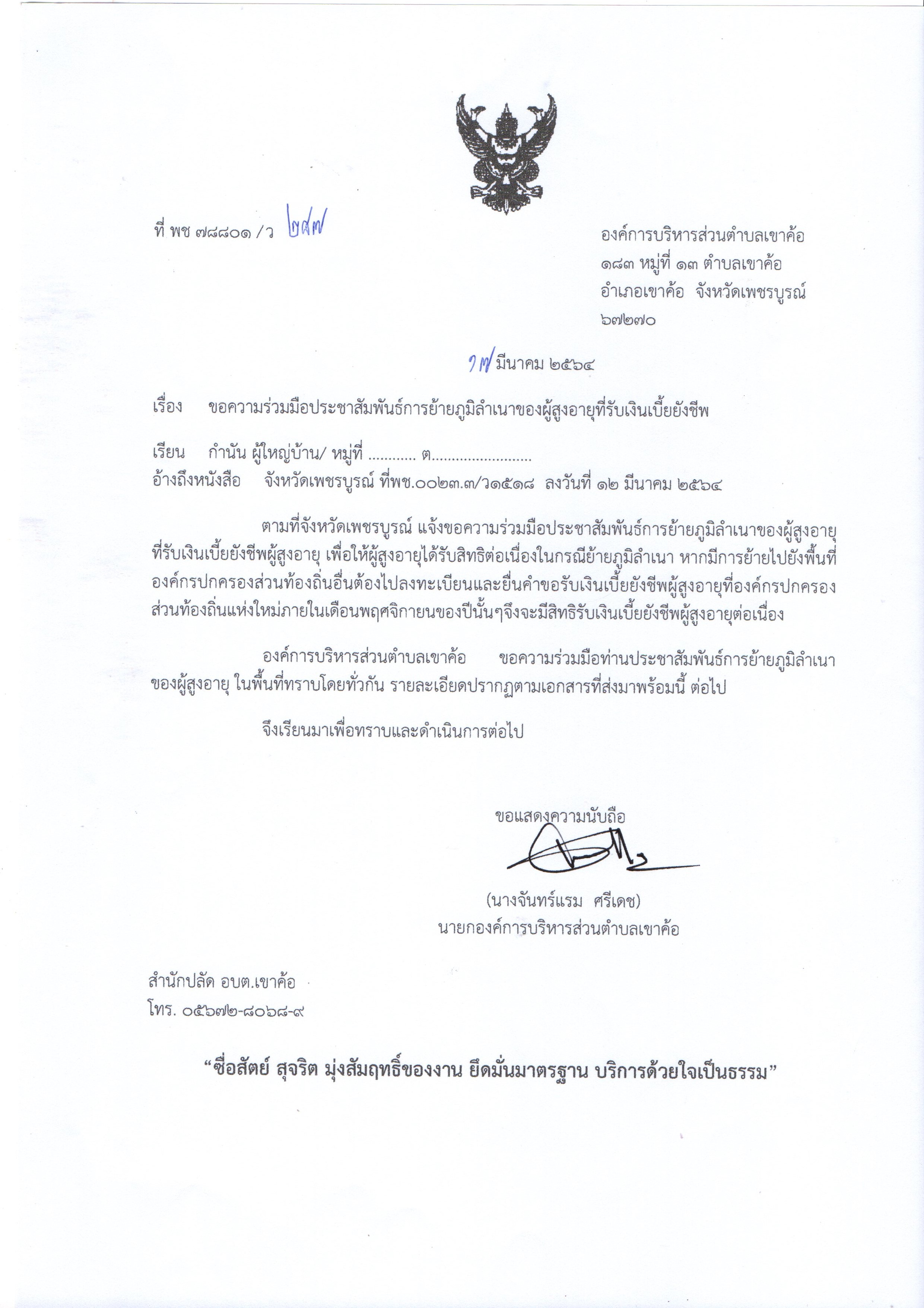 ประชาสัมพันธ์การย้ายภูมิลำเนาของผู้สูงอายุที่ได้รับเบี้ยยังชีพ
