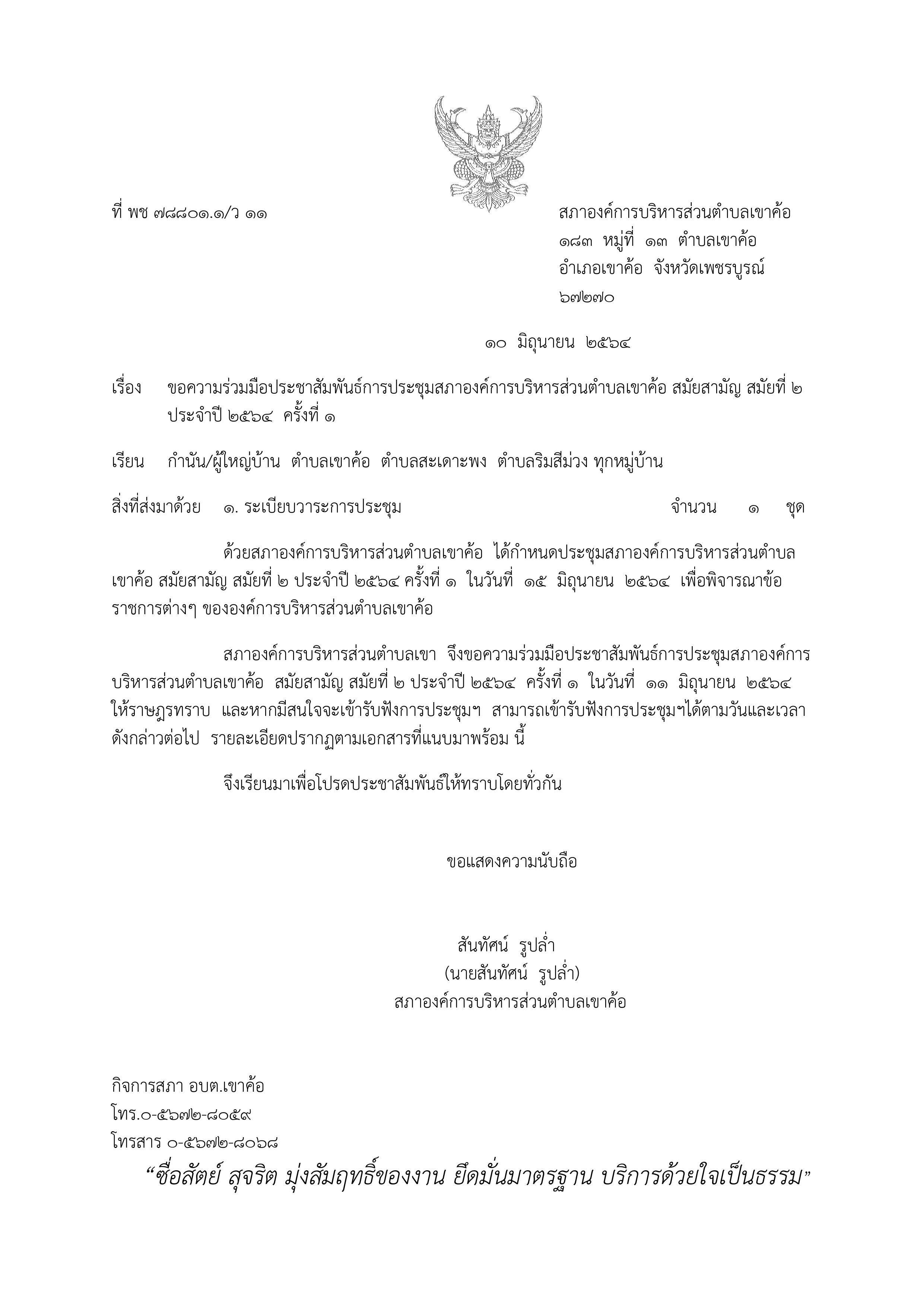 ชื่อเรื่อง : ประชาสัมพันธ์การประชุมสภาองค์การบริหารส่วนตำบลเขาค้อ สมัยสามัญ สมัยที่้ 2 ประจำปี 2564