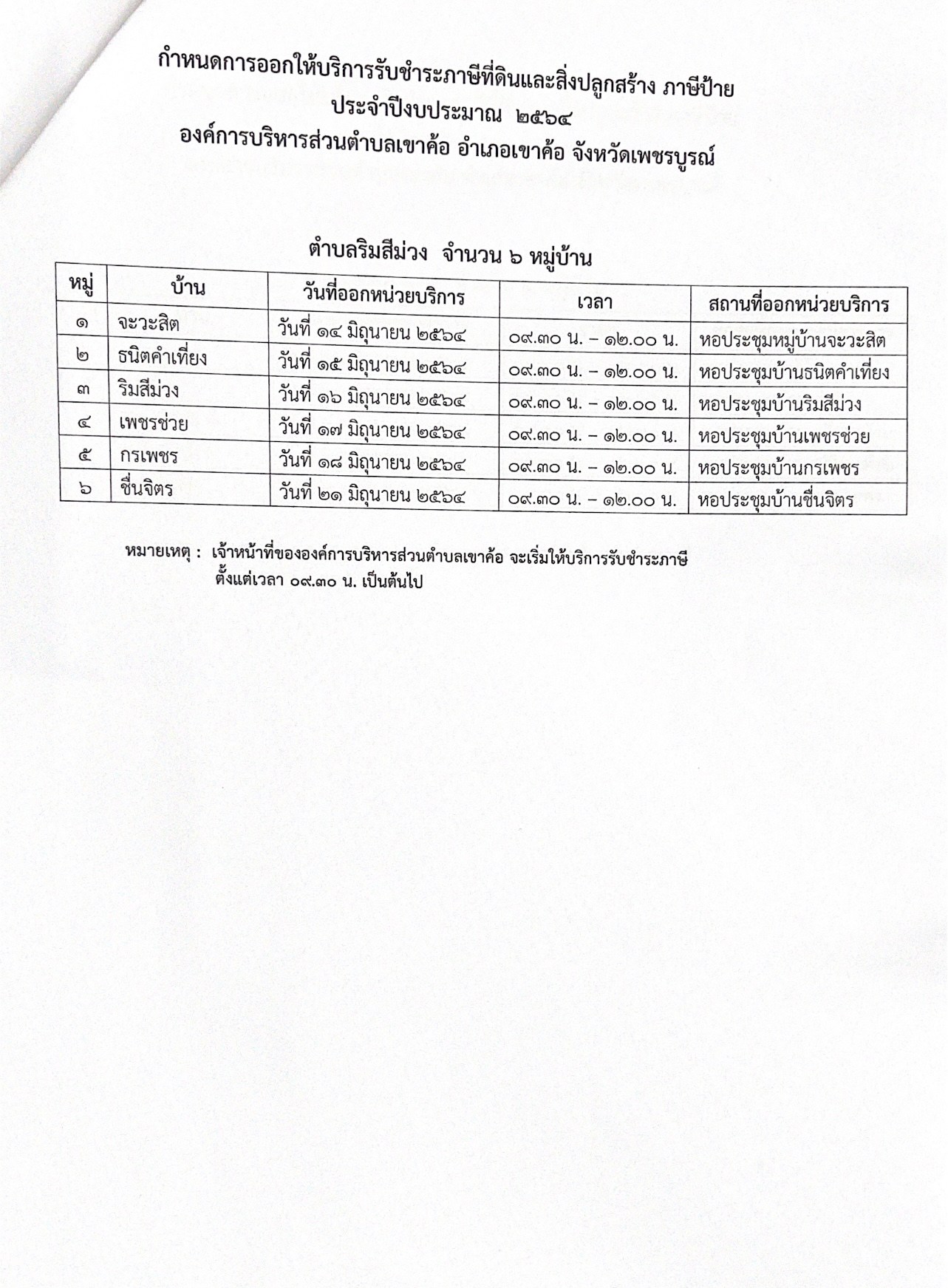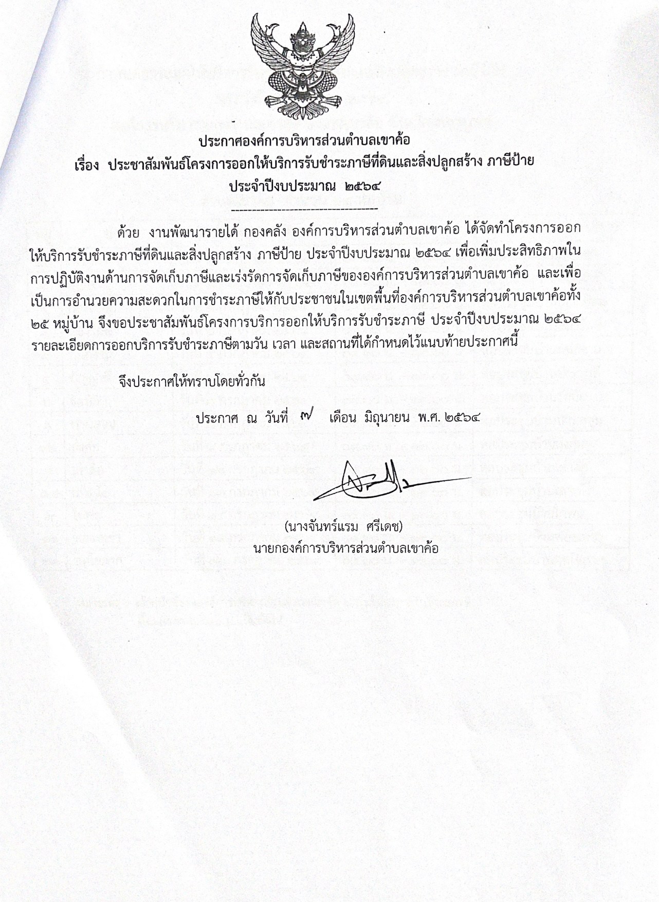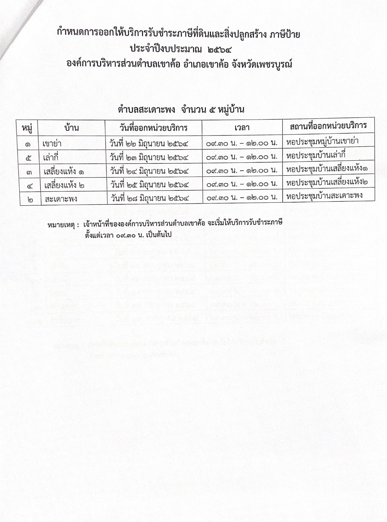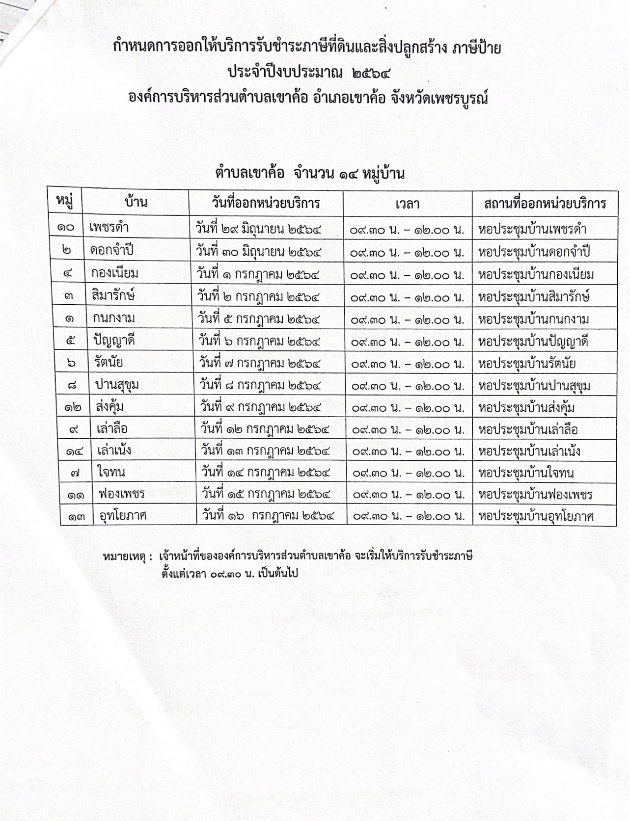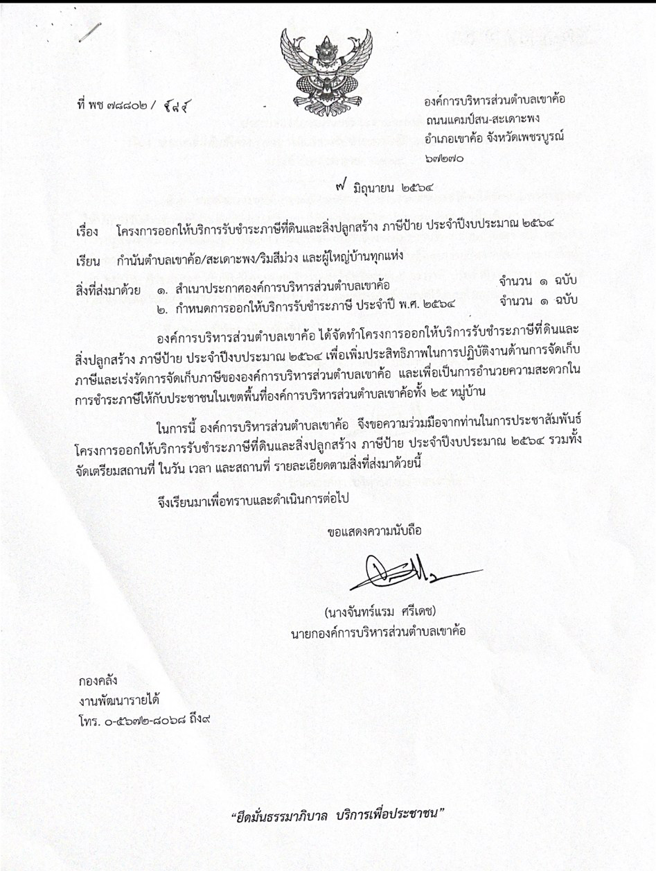 ประชาสัมพันธ์การออกให้บริการรับชำระภาษีนอกสถานที่ระหว่างวันที่ 14 มิถุนายน 2564- 16 กรกฎาคม 2564