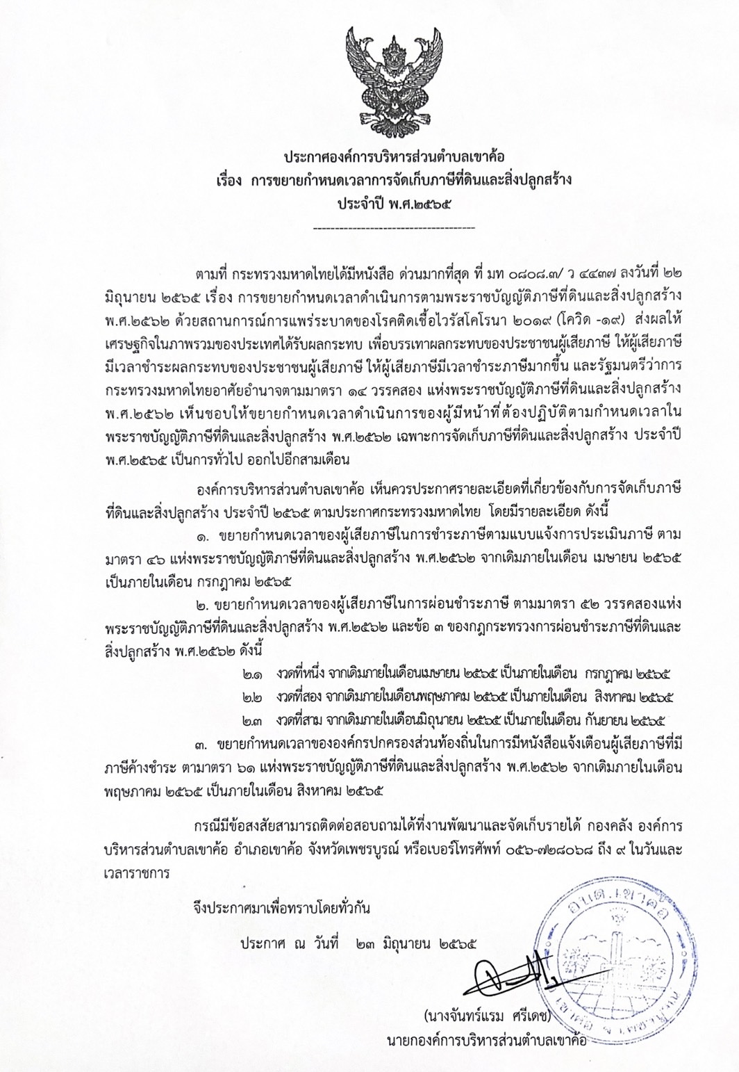 ประกาศองค์การบริหารส่วนตำบลเขาค้อ เรื่องการขยายกำหนดเวลาการจัดเก็บภาษีที่ดินและสิ่งปลูกสร้าง