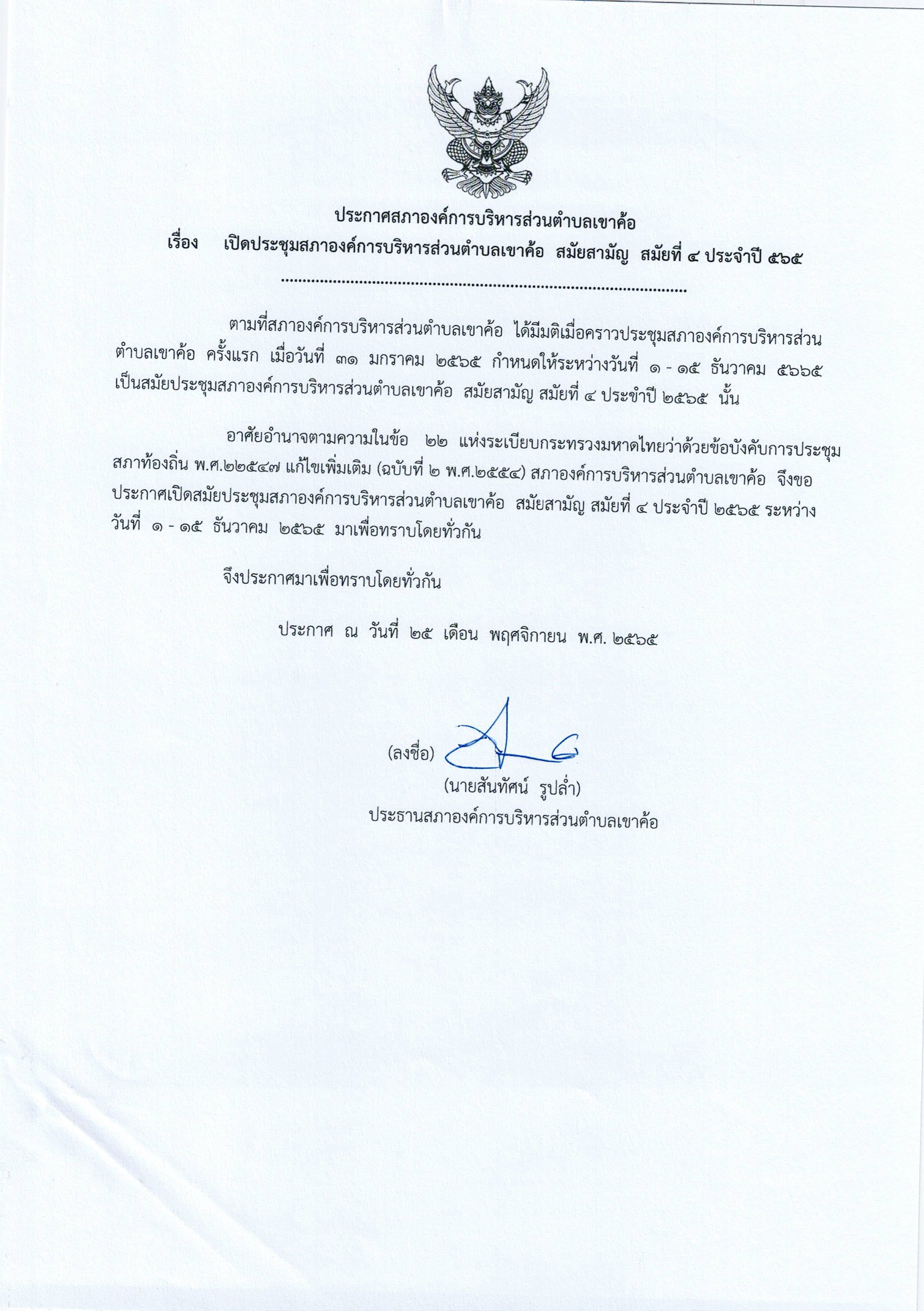 ประกาศเปิดประชุมสภา อบต.เขาค้อ สมัยสามัญ สมัยที่ 4 ประจำปี 2565
