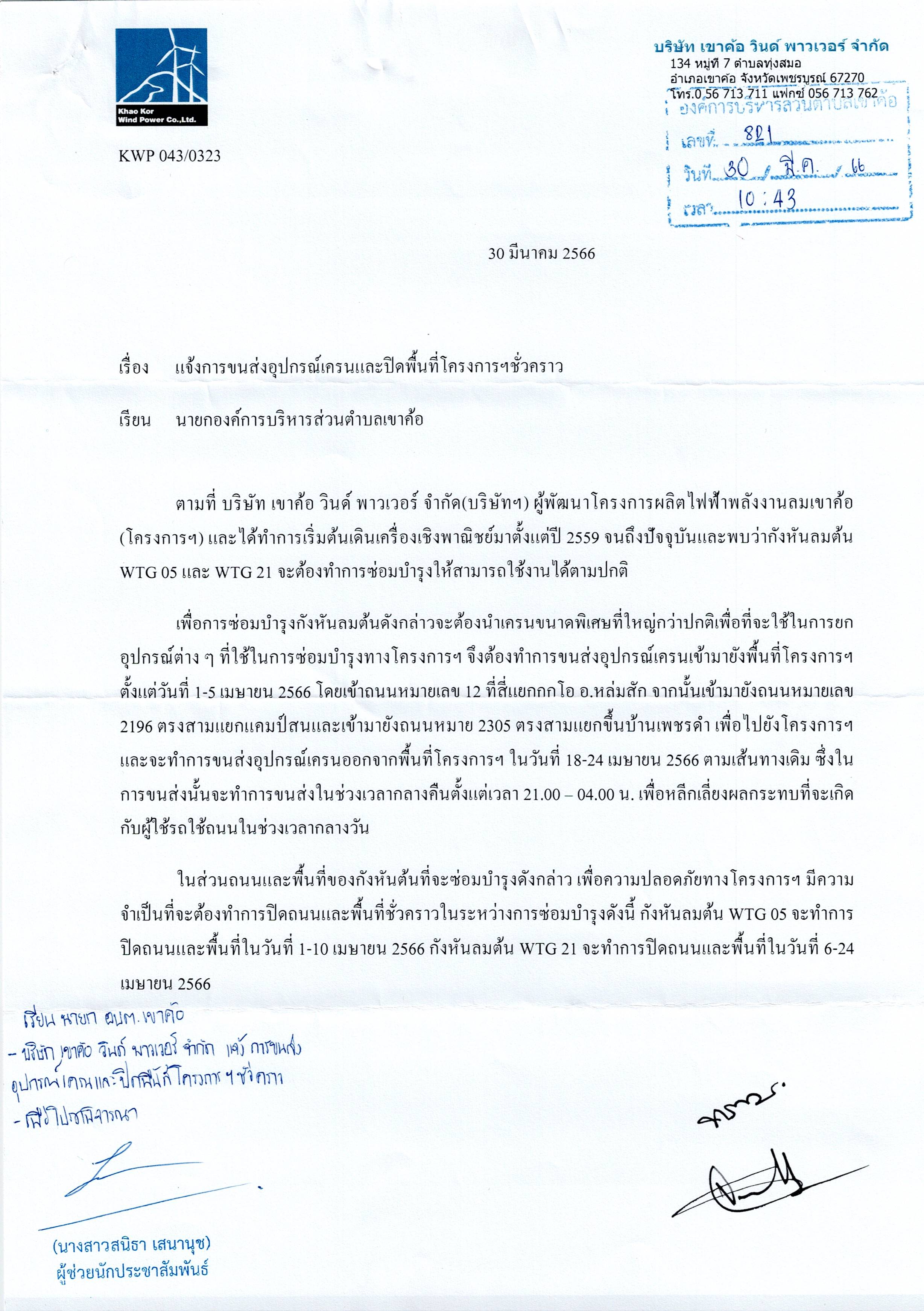 รายละเอียด : องค์การบริหารส่วนตำบลเขาค้อ ขอประชาสัมพันธ์การขนส่งอุปกรณ์เครน และปิดพื้นที่โครงการฯ ชั่วคราว ของบริษัท เขาค้อ วินด์ พาวเวอร์ จำกัด เพื่อหลีกเลี่ยงเส้นทางตามวันและเวลา ดังกล่าว