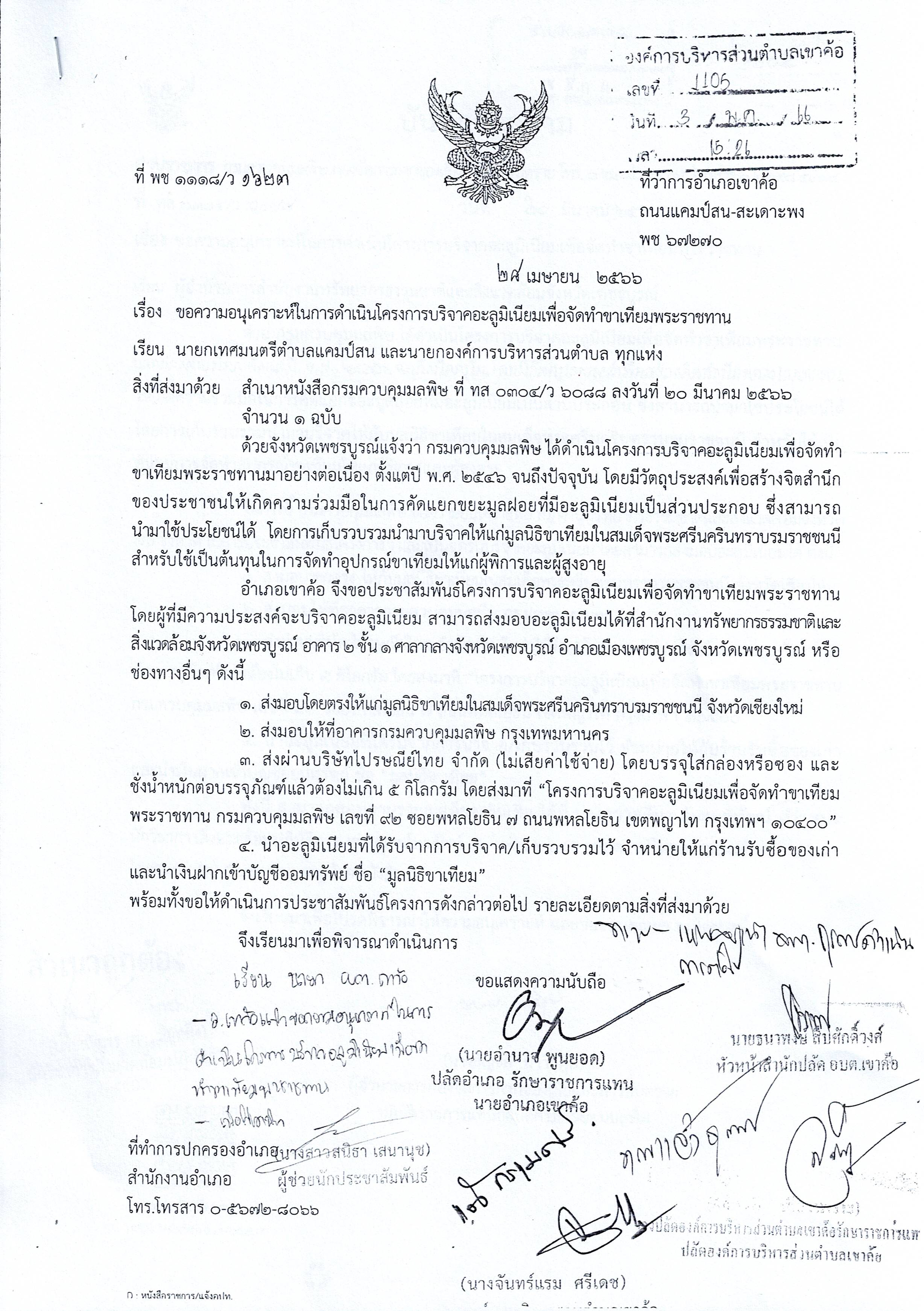 รายละเอียด : องค์การบริหารส่วนตำบลเขาค้อ ขอประชาสัมพันธ์โครงการบริจาคอะลูมิเนียมเพื่อจัดทำขาเทียมพระราชทาน พร้อมสถานที่รับบริจาค มาเพื่อทราบและร่วมบริจาคโดยทั่วกัน