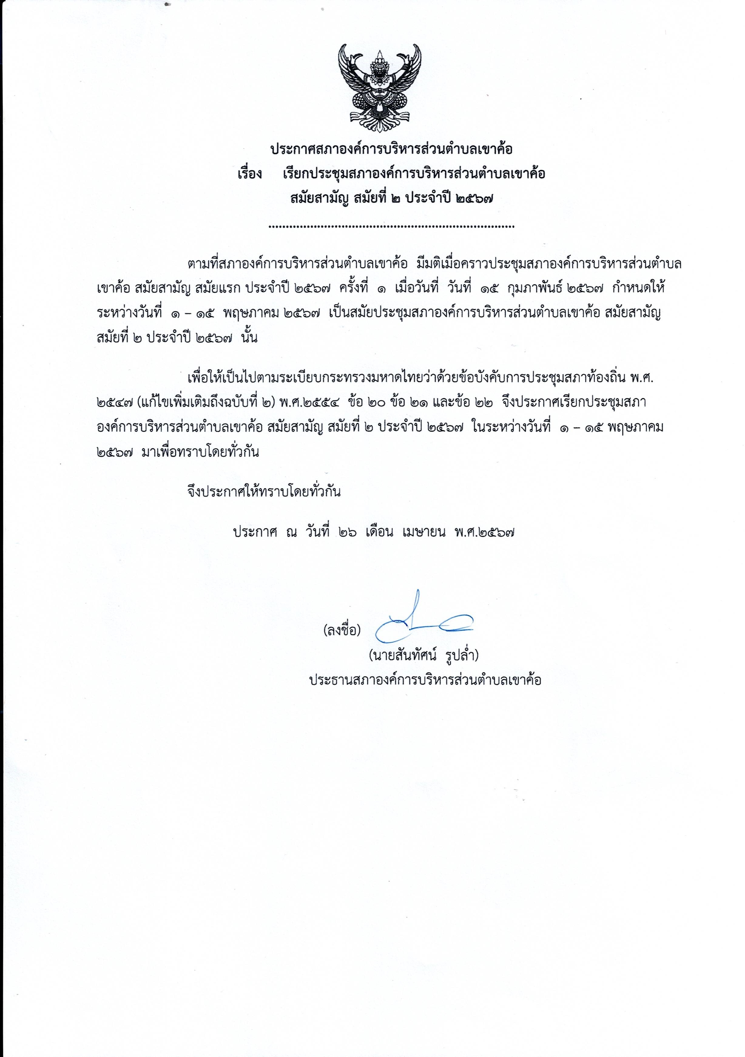 ชื่อเรื่อง : ประกาศเรียกประชุมสมัยสามัญ สมัยที่ 2 ประจำปี 2567