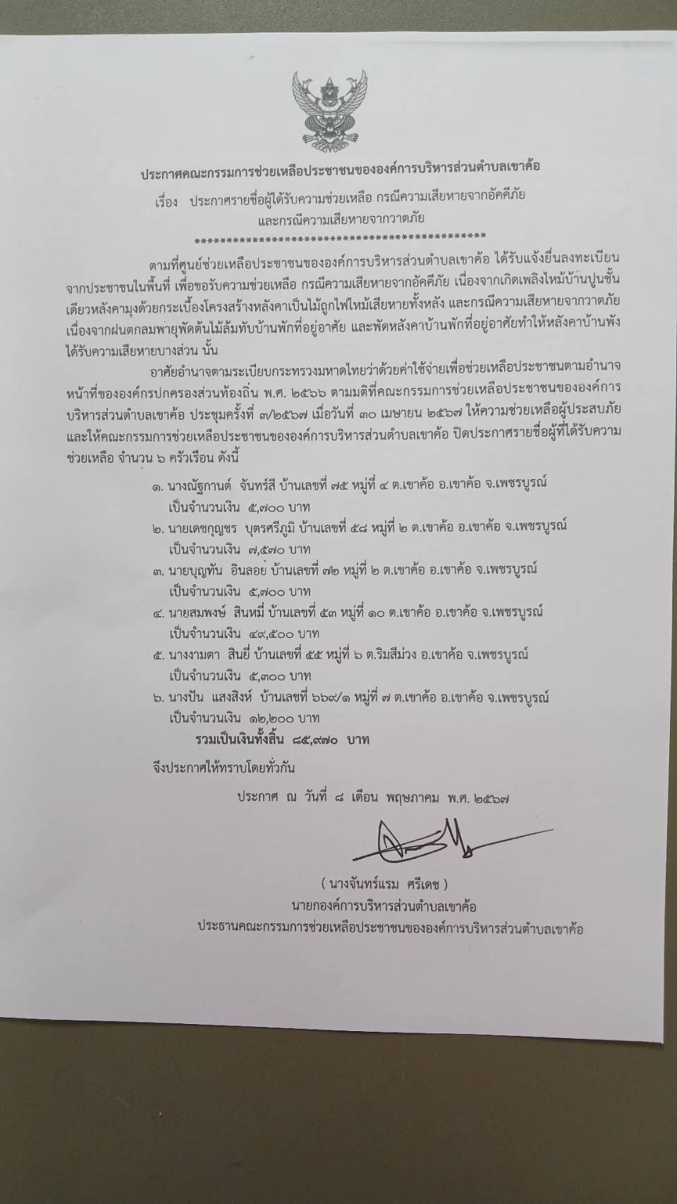 องค์การบริหารส่วนตำบลเขาค้อ ขอประกาศรายชื่อผู้ได้รับความช่วยเหลือจากอัคคีภัย มาเพื่อทราบโดยทั่วกัน