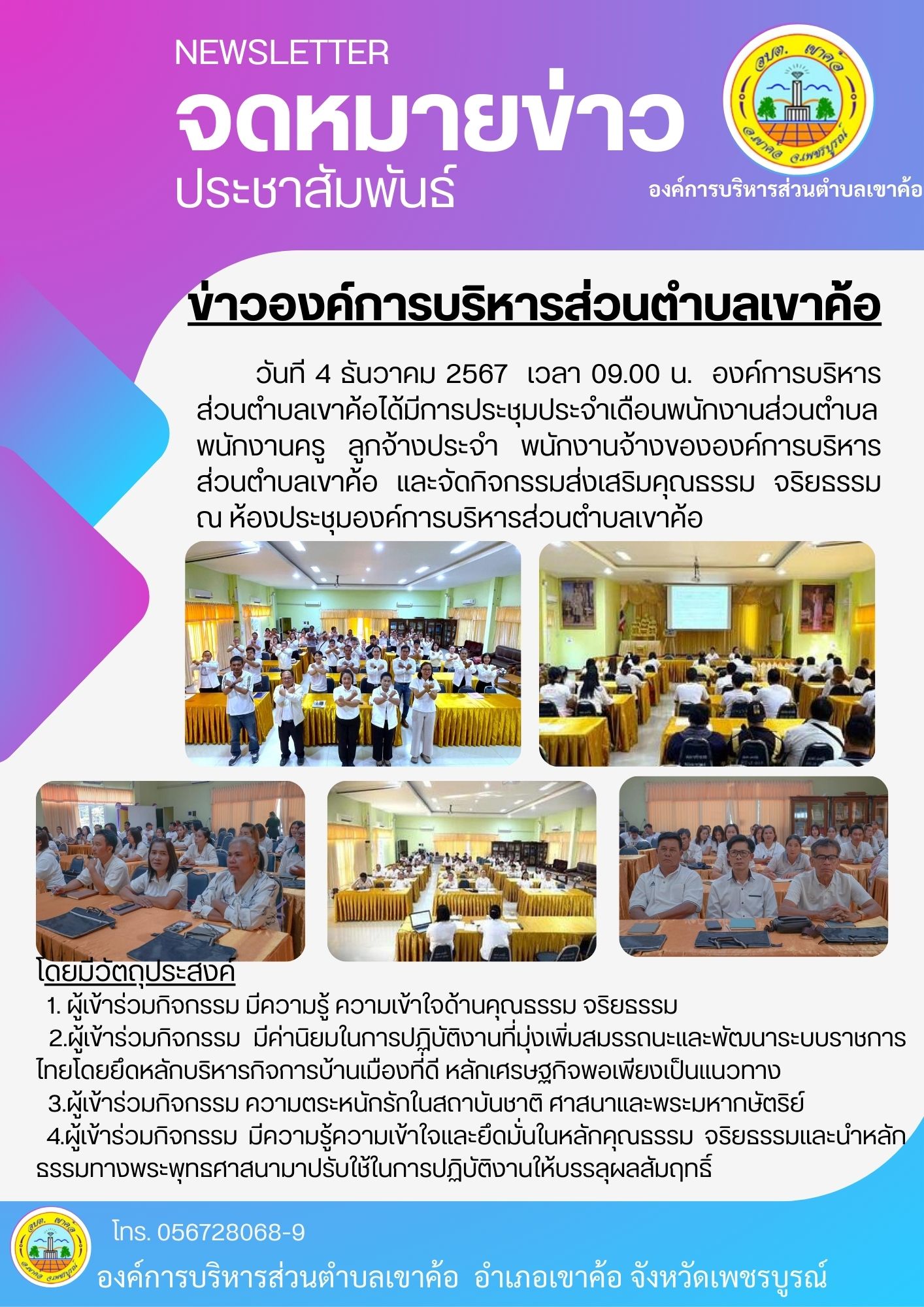 รายละเอียด : วันที่ 4 ธันวาคม 2567 เวลา 09.00 น. องค์การบริหารส่วนตำบลเขาค้อได้มีการประชุมประจำเดือนพนักงานส่วนตำบล พนักงานครู ลูกจ้างประจำ พนักงานขององค์การบริหารส่วนตำบลเขาค้อและได้จัดกิจกรรมส่งเสริมคุณธรรม จริยธรรม ณ ห้องประชุมองค์การบริหารส่วนตำบลเขาค้อ