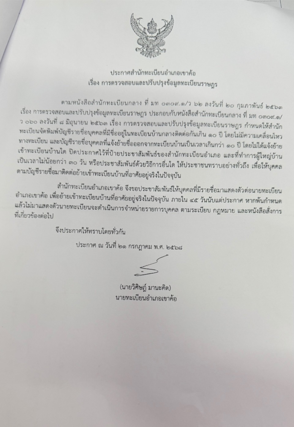 ประกาศสำนักทะเบียนอำเภอ เรื่อง การตรวจสอบและปรับปรุงข้อมูลทะเบียนราษฎร