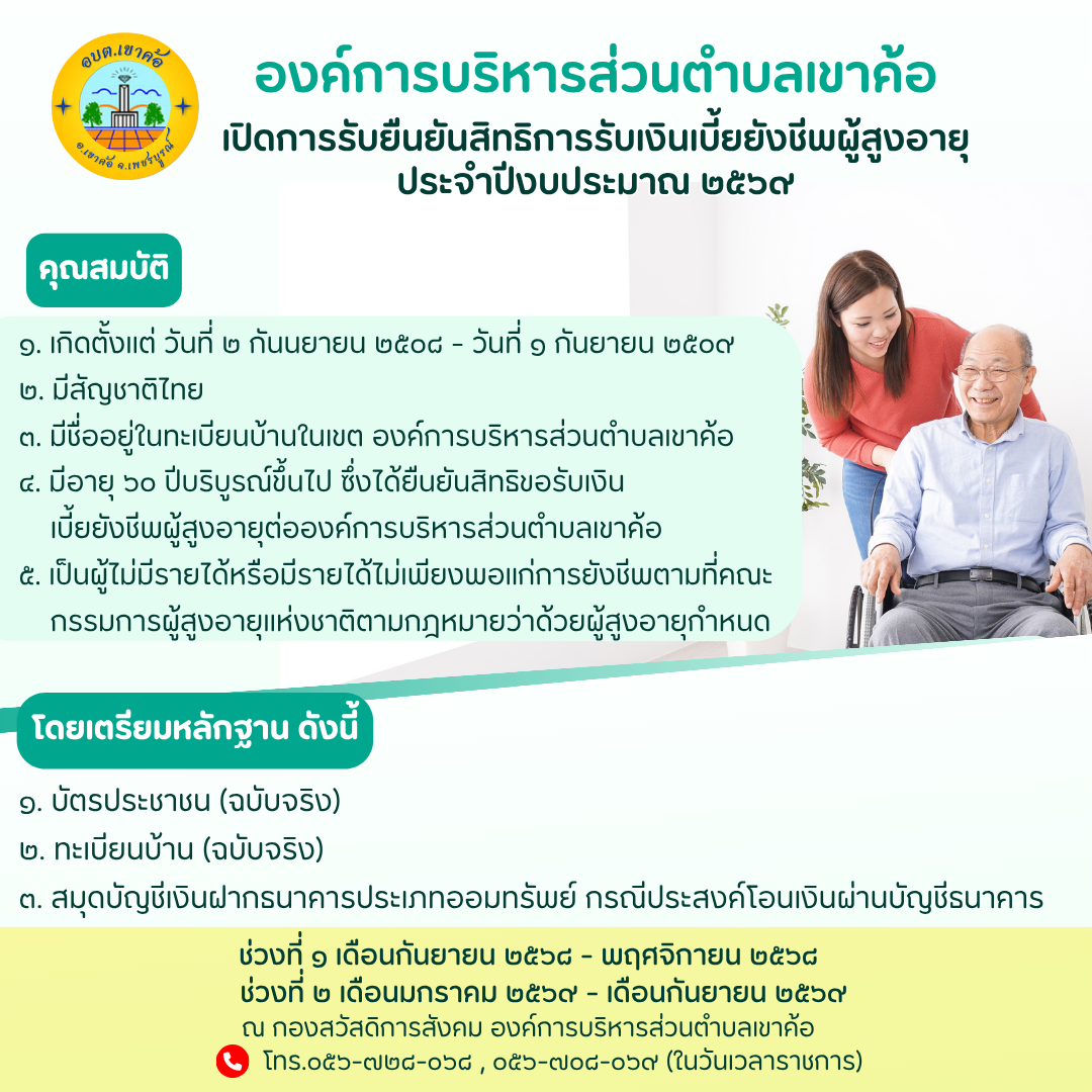 รายละเอียด : องค์การบริหารส่วนตำบลเขาค้อ ขอประชาสัมพันธ์ เรื่อง เปิดการรับยืนยันสิทธิ์ การรับเงินเบี้ยยังชีพผู้สูงอายุประจำปีงบประมาน 2569 ให้ทราบโดยทั่วกัน
