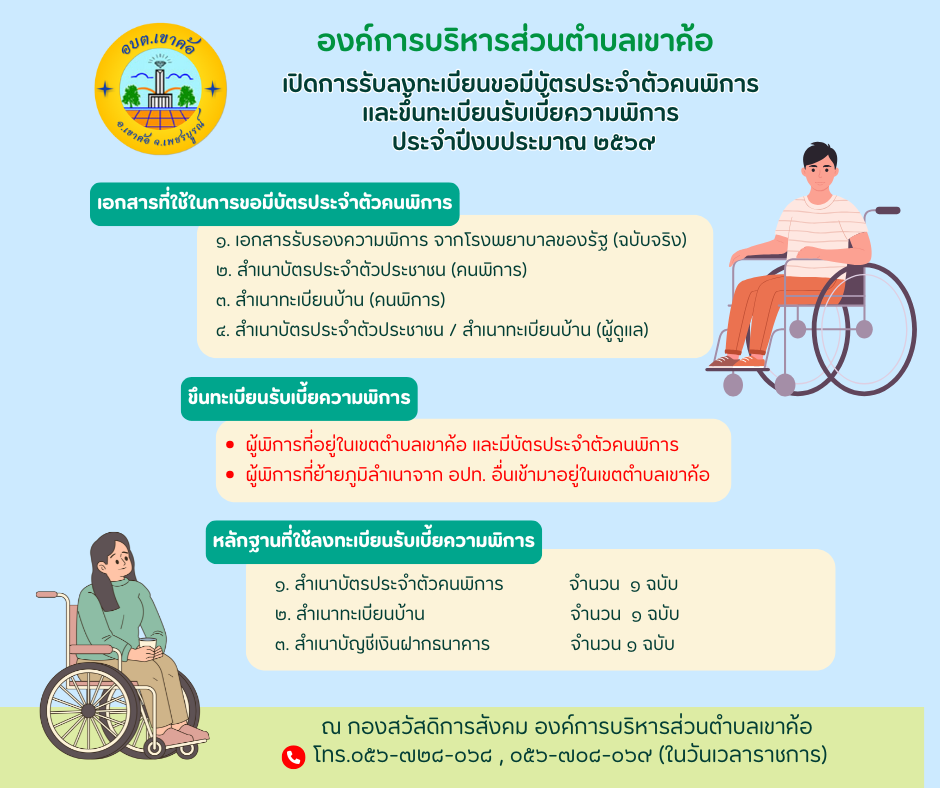 รายละเอียด : องค์การบริหารส่วนตำบลเขาค้อ ขอประชาสัมพันธ์ เรื่อง เปิดการรับลงทะเบียนขอมีบัตรประจำตัวคนพิการ และขึ้นทะเบียนความพิการ ประจำปีงบประมาณ 2569 ให้ทราบโดยทั่วกัน