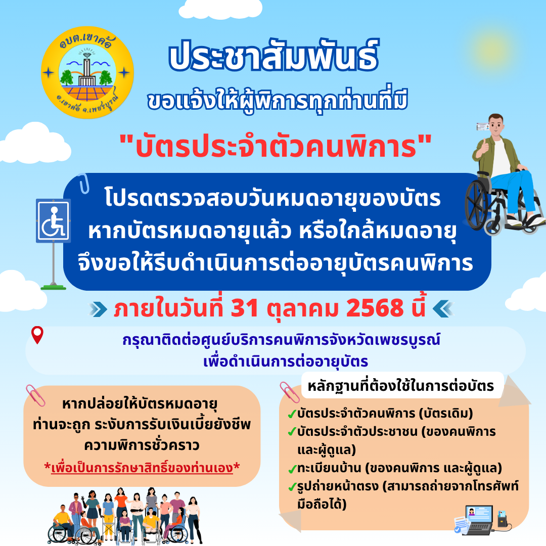 รายละเอียด : องค์การบริหารส่วนตำบลเขาค้อ ขอประชาสัมพันธ์ แจ้งให้ผู้พิการทุกท่านที่มี บัตรประจำตัวคนพิการ โปรดตรวจสอบวันหมดอายุของบัตร หากบัตรหมดอายุแล้ว หรือใกล้หมดอายุ ให้ดำเนินการต่ออายุบัตรคนพิการ ณ ศูนย์บริการคนพิการจังหวัดเพชรบูรณ์